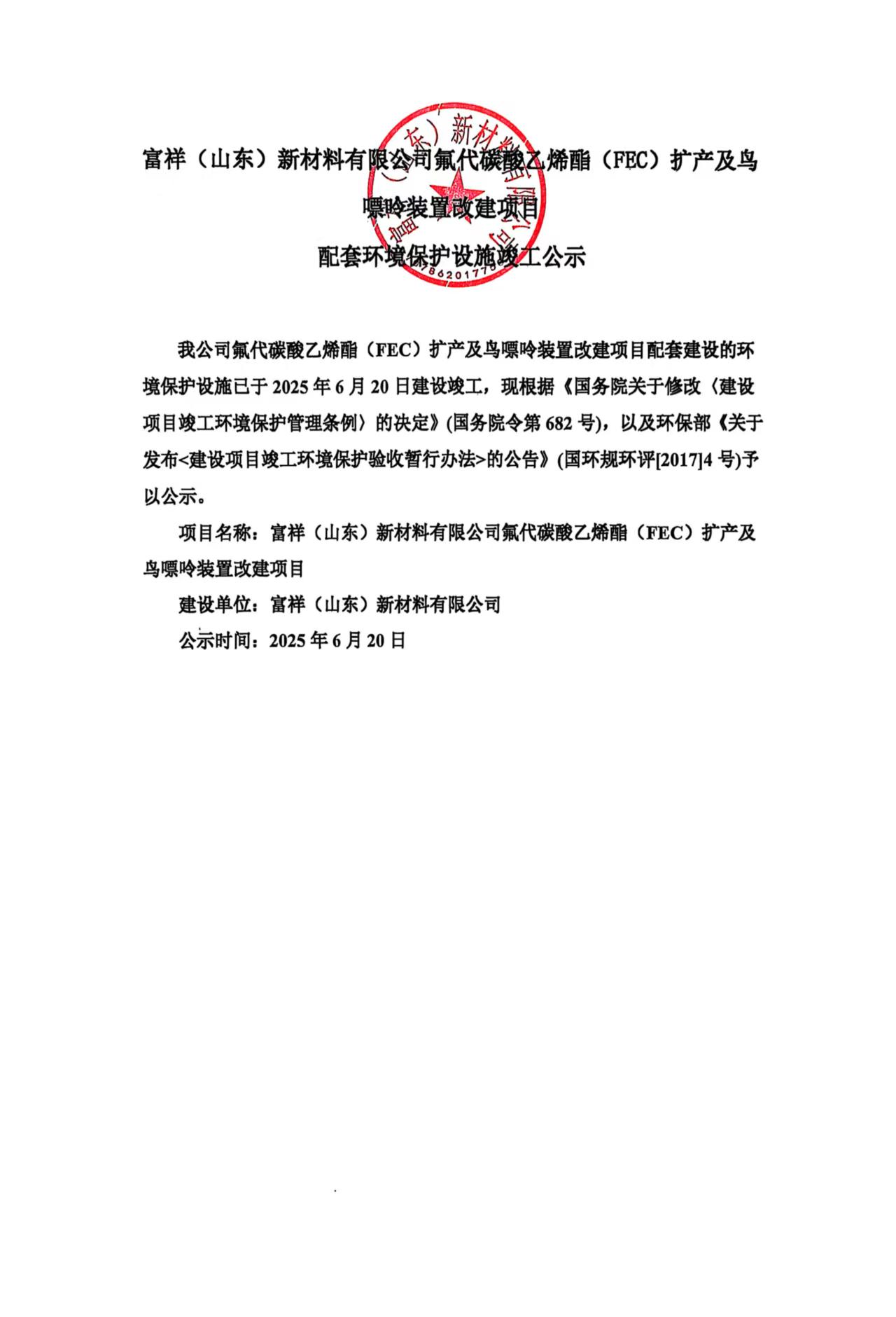 富祥(山东)新材料有限公司氟代碳酸乙烯酯(PEC)扩产及鸟 嘌呤装置改建项目配套环境保护设施竣工公示